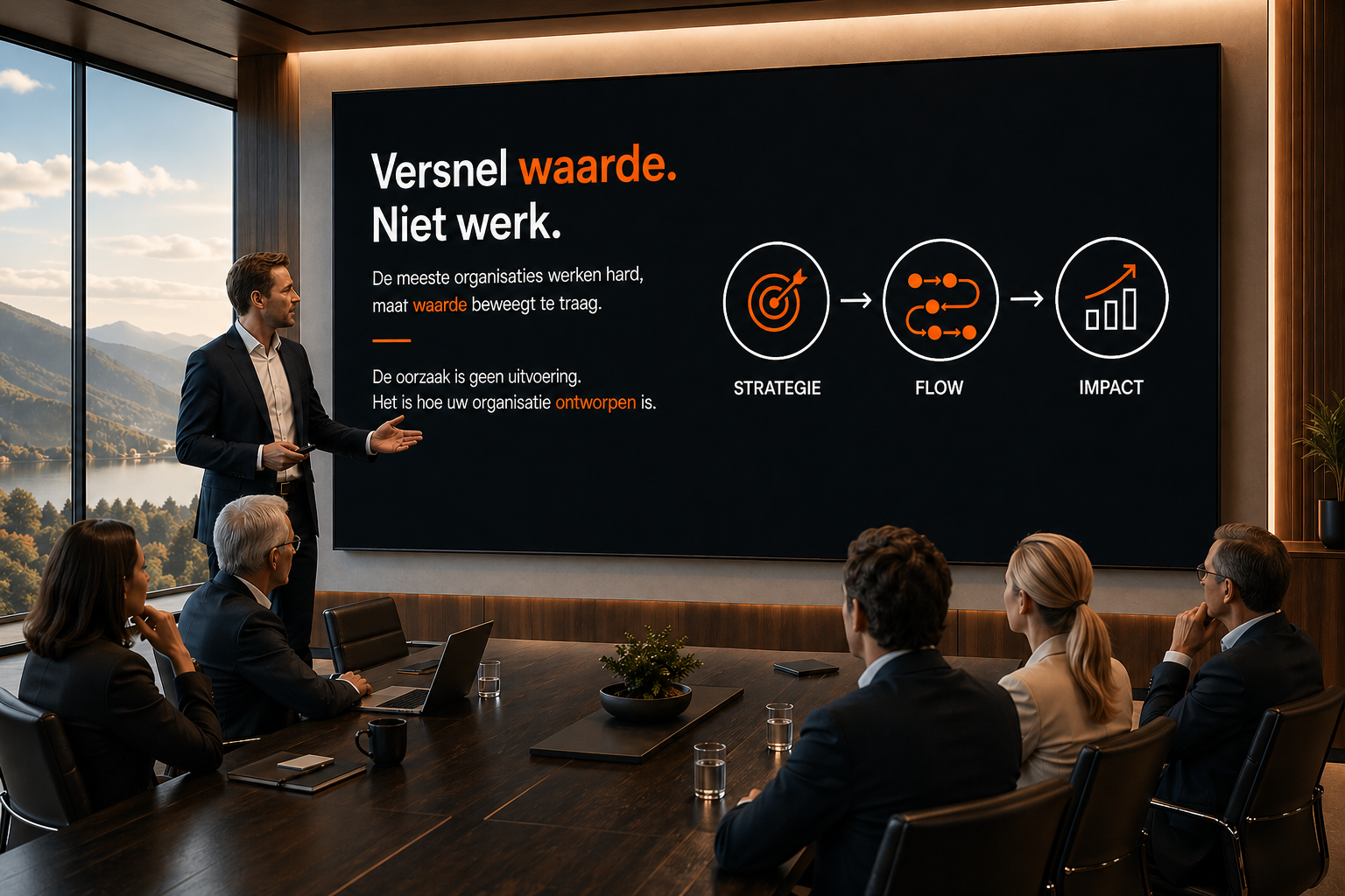 Implementeer flow metrics (flow time, load, efficiency, velocity) Introduceer WIP-limieten en focus op bottlenecks Activeer wekelijkse flow reviews per value stream Start met 1–2 pilots voor snelle validatie